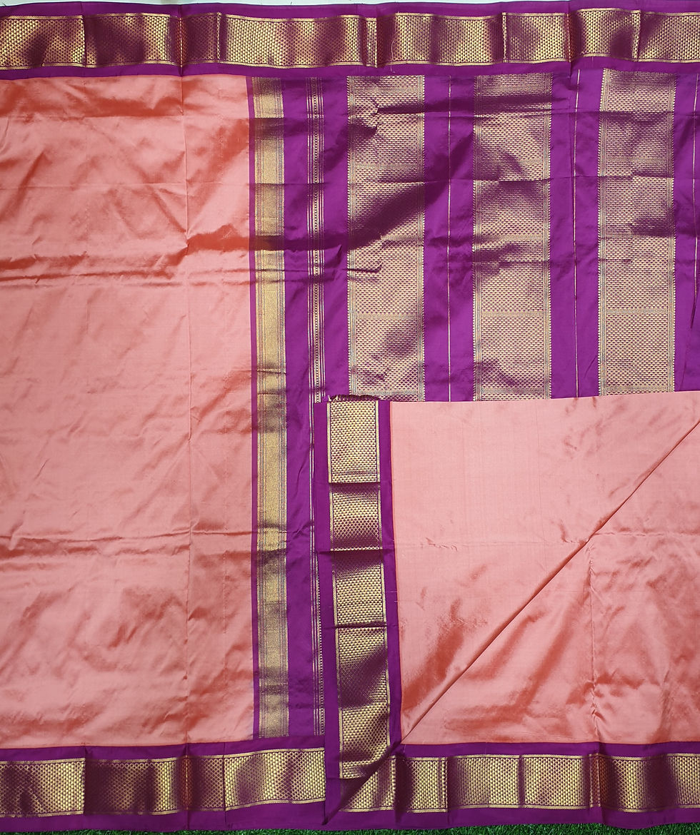 Nine-yard sarees also is known as the “Madisar” bring out the age-old Brahmin tradition in nine yards of pure silk. It depicts the deep-rooted Iyer or Iyengar in every Brahmin lady with so much elegance. The unique way of draping this Kanchipuram silk saree is widely known to represent the Brahmin community. These elegant sarees are a must-have for every wedding and special occasion. The Contrast border and the rich pallu work makes this a very unique wear. The soft weave of the saree makes this easy to drape and carry. A perfect temple wear...