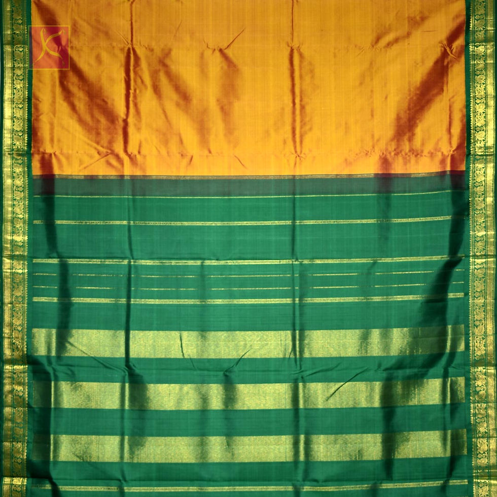Nine-yard sarees also is known as the “Madisar” bring out the age-old Brahmin tradition in nine yards of pure silk. It depicts the deep-rooted Iyer or Iyengar in every Brahmin lady with so much elegance. The unique way of draping this Kanchipuram silk saree is widely known to represent the Brahmin community. These elegant sarees are a must-have for every wedding and special occasion. The Contrast border and the rich pallu work makes this a very unique wear. The soft weave of the saree makes this easy to drape and carry. A perfect temple wear...